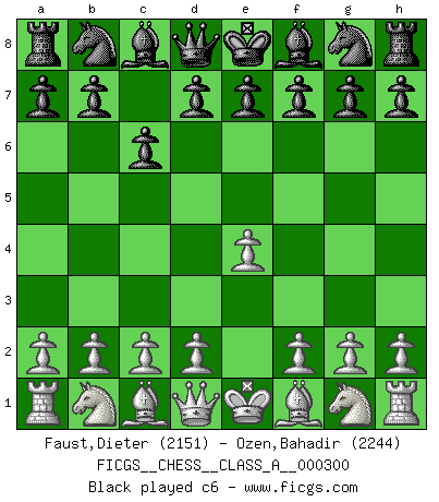 Last move : c6 2026 February 15 17:31:17 White clock - 39 days 20:06:07 Black clock - 39 days 17:48:45 [Event "FICGS__CHESS__CLASS_A__000300"] [Site "FICGS"] [Date "2026.02.15"] [Round "1"] [White "Faust,Dieter"] [Black "Ozen,Bahadir"] [Result "*"] [WhiteElo "2151"] [BlackElo "2244"] 1.e4 c6 2.* Follow this game move after move (download)The most powerful weapon in Chess is to have the next move. (David Bronstein) Privat ist Kortschnoi kein schlechter Mensch, sehr sympathisch. Aber während des Spiels ist er grausam. Er will dich töten. (Miguel Najdorf) Las piezas de Ajedrez son los bloques del alfabeto que moldean los pensamientos; y esos pensamientos, aunque hagan un diseño visual en el tablero, expresan abstractamente su belleza como un poema. (Marcel Duchamp) Les échecs sont un jeu terrible. Si vous n'avez pas le centre, votre adversaire a une position plus libre. Par contre, si vous avez le centre, alors vous avez vraiment quelque chose pour laquelle vous inquiéter ! (Siegbert Tarrasch) Yoga is 99% practice and 1% knowledge. (Sri Krishna Pattabhi Jois)