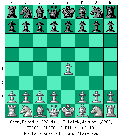 Last move : e4 2026 February 18 15:28:51 White clock - 30 days 22:19:48 Black clock - 29 days 16:55:33 [Event "FICGS__CHESS__RAPID_M__000181"] [Site "FICGS"] [Date "2026.02.18"] [Round "1"] [White "Ozen,Bahadir"] [Black "Swiatek,Janusz"] [Result "*"] [WhiteElo "2244"] [BlackElo "2266"] 1.e4 * Follow this game move after move (download)Good offense and good defense both begin with good development. (Bruce A. Moon) Besser ein falscher Plan, logisch durchgeführt, als gar kein Plan. (Viktor Kortschnoi) Tu no necesitas jugar muy bien, únicamente ayudar a tu oponenet a que juegue muy mal. (Genrikh Chepukaitis) On est toujours la mazette de quelqu'un d'autre. (Anonyme) Luck never made a man wise. (Seneca, Letters to Lucilius)