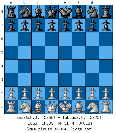 First move 2026 February 18 13:48:39 White clock - 29 days 15:15:22 Black clock - 30 days 00:00:00 [Event "FICGS__CHESS__RAPID_M__000181"] [Site "FICGS"] [Date "2026.02.18"] [Round "1"] [White "Swiatek,Janusz"] [Black "Taboada,Pedro Pablo"] [Result "*"] [WhiteElo "2266"] [BlackElo "2272"] 1.* Follow this game move after move (download)I don't believe in psychology. I believe in good moves. (Bobby Fischer) Es liegt in der Natur, vernüftig zu denken und unlogisch zu handeln. (Anatole France) En la vida, como en el Ajedrez, los Peones propios obstruyen nuestro camino. La gran fortuna de un hombre, su comodidad, placer, hijos, libros, que deberían ayudarle a ganar, con mucha frecuencia lo ponen en Jaque Mate. (Charles Buxton) La tactique est l'élément le plus important du milieu de jeu. (Siegbert Tarrasch) Only sick music makes money today. (Friedrich Nietzsche)