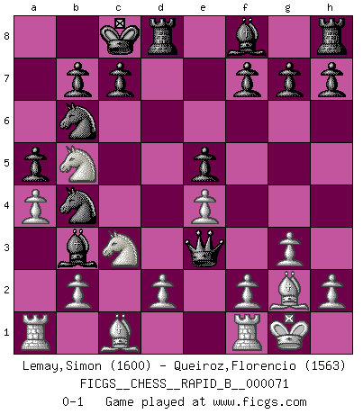 Last move : 0-1 2007 November 9 2:53:29 [Event "FICGS__CHESS__RAPID_B__000071"] [Site "FICGS"] [Date "2007.10.12"] [Round "1"] [White "Lemay,Simon"] [Black "Queiroz,Florencio"] [Result "0-1"] [WhiteElo "1600"] [BlackElo "1563"] 1.c4 e5 2.g3 Nf6 3.Bg2 d5 4.cxd5 Nxd5 5.Nc3 Nb6 6.e4 Nc6 7.Nge2 Be6 8.O-O Qd3 9.a4 a5 10.Nb5 Bb3 11.Qe1 O-O-O 12.Nec3 Nb4 13.Qe3 Qxe3 0-1 English Opening Kingside Castling by player White (move 8) Queenside Castling by player Black (move 11) Player Black won this chess game. Follow this game move after move (download)Only the player with the initiative has the right to attack. (Wilhelm Steinitz) Gewöhnliche Menschen denken nur daran, wie sie ihre Zeit verbringen. Ein intelligenter Mensch versucht, sie auszunutzen. (Arthur Schopenhauer) ¿Se han dado cuenta de que Fischer casi nunca ha tenido piezas malas? El las intercambia y las piezas malas se quedan con sus oponenets. (Yuri Balashov) Le thème de l'attaque double intervient d'une manière ou d'une autre dans l'immense majorité des combinaisons. (Youri Averbakh) Unless in communicating with it one says exactly what one means, trouble is bound to result. (Alan Turing, about computers)