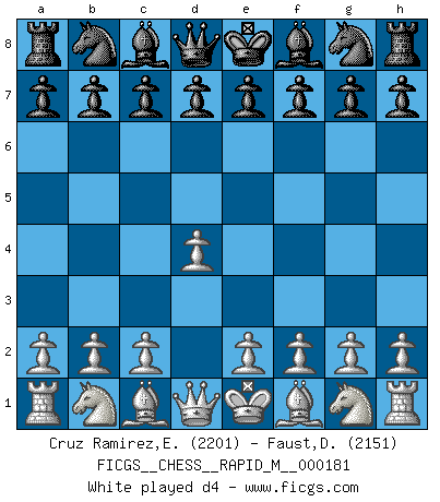 Last move : d4 2026 February 18 14:27:45 White clock - 30 days 23:20:54 Black clock - 29 days 17:34:51 [Event "FICGS__CHESS__RAPID_M__000181"] [Site "FICGS"] [Date "2026.02.18"] [Round "1"] [White "Cruz Ramirez,Eliecer"] [Black "Faust,Dieter"] [Result "*"] [WhiteElo "2201"] [BlackElo "2151"] 1.d4 * Follow this game move after move (download)I don't believe in psychology. I believe in good moves. (Bobby Fischer) Ein Kibitz ist einer, der deinem Gegner gute Ratschläge gibt. (Andrew Soltis) Aquellos que dicen que entienden al Ajedrez, no entienden nada. (Robert Hubner) Ce qui caractérise les parties de combat, c'est que si le défenseur a constamment de difficiles problèmes à résoudre, l'attaquant doit chercher sans relâche de nouvelles possibilités d'attaque. (Koblentz) The large trees attract high winds. (Chinese proverb)