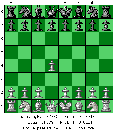 First move 2026 February 18 13:48:39 White clock - 29 days 13:21:14 Black clock - 30 days 00:00:00 [Event "FICGS__CHESS__RAPID_M__000181"] [Site "FICGS"] [Date "2026.02.18"] [Round "1"] [White "Taboada,Pedro Pablo"] [Black "Faust,Dieter"] [Result "*"] [WhiteElo "2272"] [BlackElo "2151"] 1.* Follow this game move after move (download)Fischer, who may or may not be mad as a hatter, has every right to be horrified. (Jeremy Silman) Ich spiele ehrlich und spiele, um zu gewinnen. Wenn ich verliere nehme ich meine Medizin. (Robert James Fischer) Los asuntos humanos son como una partida de Ajedrez: solo aquellos que no lo toman seriamente, pueden ser llamados buenos jugadores. (Hung Tzu Ch'eng) Nous sommes les pions de la mystérieuse partie d'Echecs jouée par Dieu. Il nous déplace, nous arrête, nous pousse encore, puis nous lance un à un dans la boîte du Néant. Epitaphe sur la tombe de David Janowsky (1868-1927). The real danger is not that computers will begin to think like men, but that men will begin to think like computers. (Sydney J. Harris)