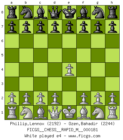 Last move : e4 2026 February 18 23:41:59 White clock - 30 days 14:06:40 Black clock - 29 days 23:12:57 [Event "FICGS__CHESS__RAPID_M__000181"] [Site "FICGS"] [Date "2026.02.18"] [Round "1"] [White "Phillip,Lennox"] [Black "Ozen,Bahadir"] [Result "*"] [WhiteElo "2192"] [BlackElo "2244"] 1.e4 * Follow this game move after move (download)Chess is ruthless: you've got to be prepared to kill people. (Nigel Short) Wenn du nicht weißt was du tun sollst, warte bis dein Gegner eine Idee hat. Sie wird sicher schlecht sein. (Siegbert Tarrasch) En la vida, como en el Ajedrez, los Peones propios obstruyen nuestro camino. La gran fortuna de un hombre, su comodidad, placer, hijos, libros, que deberían ayudarle a ganar, con mucha frecuencia lo ponen en Jaque Mate. (Charles Buxton) Aux échecs, l'amour-propre est satisfait quand on remporte la victoire, mais il n'y a pas de honte à être battu. (Benjamin Franklin) If things go wrong, don't go with them. (Roger Babson)