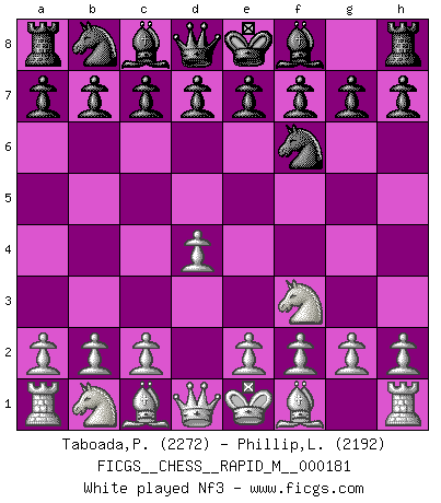 First move 2026 February 18 13:48:39 White clock - 29 days 13:21:14 Black clock - 30 days 00:00:00 [Event "FICGS__CHESS__RAPID_M__000181"] [Site "FICGS"] [Date "2026.02.18"] [Round "1"] [White "Taboada,Pedro Pablo"] [Black "Phillip,Lennox"] [Result "*"] [WhiteElo "2272"] [BlackElo "2192"] 1.* Follow this game move after move (download)In complicated positions, Bobby Fischer hardly had to be afraid of anybody. (Paul Keres) Viele Opfer benötigen überhaupt keine konkrete Berechnung. Es genügt sich die entstehende Position kurz vorzustellen, um uns davon zu überzeugen, dass das Opfer korrekt ist. (Mikhail Nekhemyevich Tal) El Ajedrez es un juego de pelea el cual es puramente intelectual e incluye la suerte. (Richard Reti) Il n'y a pas eu de défaite parce que je ne crois pas que cet ordinateur ait jamais existé. IBM a triché en refusant d'imprimer les modes de recherche de la machine. C'est évident, pendant le match, des coups décisifs ont été joués par des êtres humains. Aujourd'hui, les meilleurs spécialistes en informatique ne peuvent toujours pas expliquer comment Deep-Blue a pu jouer contre la logique des ordinateurs. IBM a gagné une guerre de communication, mais ils sont incapables de prouver que l'ordinateur a gagné tout seul. (Garry Kasparov) The greatest con, that he ever pulled... was making you believe... that he is you. (Revolver, movie)