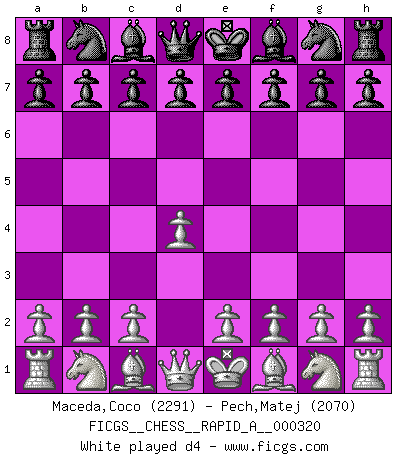 Last move : d4 2026 February 20 0:55:2 White clock - 30 days 23:59:36 Black clock - 29 days 14:05:13 [Event "FICGS__CHESS__RAPID_A__000320"] [Site "FICGS"] [Date "2026.02.20"] [Round "1"] [White "Maceda,Coco"] [Black "Pech,Matej"] [Result "*"] [WhiteElo "2291"] [BlackElo "2070"] 1.d4 * Follow this game move after move (download)Chess is really ninety nine percent calculation. (Soltis) Vom Schach wurde gesagt das Leben sei dafür nicht lange genug. Aber das ist der Fehler des Lebens, nicht des Schach'. (Irving Chernev) Durante una competencia de Ajedrez, un Maestro de Ajedrez deberá ser una combinación de presa de caza y un Monge. (Alexander Alekhine) La solitude du joueur d'Echecs à l'approche du mat est semblable à celle du condamné. (Francis Szpiner) All men can see these tactics whereby I conquer, but what none can see is the strategy out of which victory is evolved. (Sun Tzu)