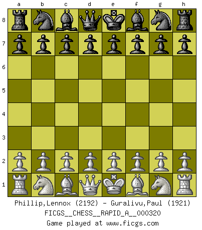 First move 2026 February 20 0:54:38 White clock - 29 days 13:03:27 Black clock - 30 days 00:00:00 [Event "FICGS__CHESS__RAPID_A__000320"] [Site "FICGS"] [Date "2026.02.20"] [Round "1"] [White "Phillip,Lennox"] [Black "Guralivu,Paul"] [Result "*"] [WhiteElo "2192"] [BlackElo "1921"] 1.* Follow this game move after move (download)On the chessboard, lies and hypocrisy do not survive long. (Emanuel Lasker) Das Blackmar-Diemer-Gambit verändert den ganzen Menschen! (Emil Joseph Diemer) Observen a Garry Kasparov. Después de una derrota, invariablemente el gana la próxima partida. Prácticamente hace pedazos a su siguiente oponente. Eso es algo que tenemos que aprender a lograr. (Maurice Ashley) À la honte des hommes, on sait que les lois du jeu sont les seules qui soient partout justes, claires, inviolables et exécutées. Pourquoi l'Indien qui a donné les règles du jeu d'échecs est-il obéi de bon gré dans toute la terre, et que les décrétales des papes, par exemple, sont aujourd'hui un objet d'horreur et de mépris ? C'est que l'inventeur des échecs combina tout avec justesse pour la satisfaction des joueurs, et que les papes, dans leurs décrétales, n'eurent en vue que leur seul avantage. L'Indien voulut exercer également l'esprit des hommes et leur donner du plaisir; les papes ont voulu abrutir l'esprit des hommes. Voltaire (Dictionnaire philosophique / Garnier 1967) A married woman is like a fish riding a bicycle. (Rodolfo d'Ettorre)