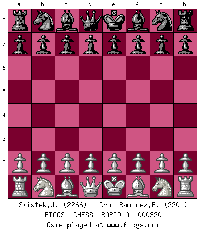 First move 2026 February 20 0:54:38 White clock - 29 days 15:59:15 Black clock - 30 days 00:00:00 [Event "FICGS__CHESS__RAPID_A__000320"] [Site "FICGS"] [Date "2026.02.20"] [Round "1"] [White "Swiatek,Janusz"] [Black "Cruz Ramirez,Eliecer"] [Result "*"] [WhiteElo "2266"] [BlackElo "2201"] 1.* Follow this game move after move (download)Of Chess it has been said that life is not long enough for it, but that is the fault of life, not Chess. (William Ewart Napier) Konzentriere dich auf materielle Gewinne. Nimm, was dir dein Gegner gibt, ausser es gibt einen guten Grund der dagegenspricht. (Robert James Fischer) Los libros de Ajedrez deben de usarse igual como usamos los anteojos: para mejorar la vista, aunque algunos jugadores los quieren usar como si ellos les otorgaran la vision. (José Raúl Capablanca) On n'a jamais que l'âge auquel on a commence à jouer aux échecs car après on cesse de vieillir. (Capablanca) A journey of a thousand sites begins with a single click. (Author unknown)