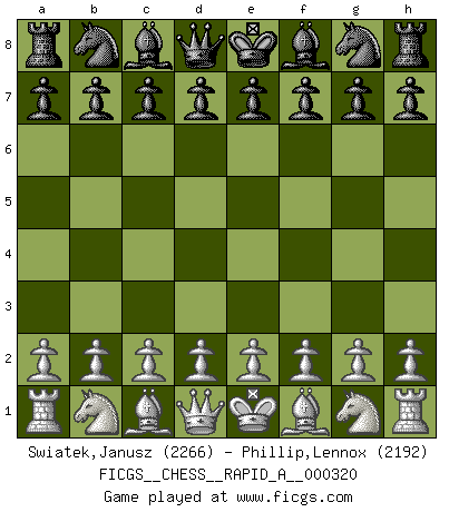 First move 2026 February 20 0:54:38 White clock - 29 days 13:02:25 Black clock - 30 days 00:00:00 [Event "FICGS__CHESS__RAPID_A__000320"] [Site "FICGS"] [Date "2026.02.20"] [Round "1"] [White "Swiatek,Janusz"] [Black "Phillip,Lennox"] [Result "*"] [WhiteElo "2266"] [BlackElo "2192"] 1.* Follow this game move after move (download)Is Bobby Fischer quite sane ? (Salo Flohr) Stil? Ich habe keinen Stil! (Anatoly Karpov) La mitad de las variaciones que son calculadas en una partida de torneo, resultan ser completamente superfluas. Desafortunadamente, nadie sabe por adelantado cual mitad. (Jan Tinman) Un millionnaire : 'Monsieur Steinitz ! Vous ne participez aux tournois que pour l'argent, alors que moi je n'y viens que pour l'honneur.' Steinitz : 'Chacun joue pour ce qu'il n'a pas'... If you work for a living, why do you kill yourself working ? (Tuco to a chicken in The Good, The Bad and The Ugly)