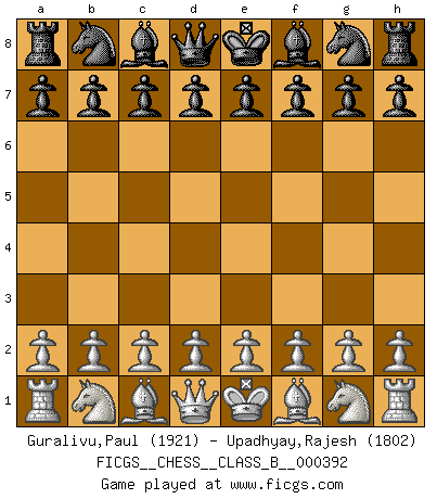 First move 2026 February 21 14:7:32 White clock - 39 days 07:26:02 Black clock - 40 days 00:00:00 [Event "FICGS__CHESS__CLASS_B__000392"] [Site "FICGS"] [Date "2026.02.21"] [Round "1"] [White "Guralivu,Paul"] [Black "Upadhyay,Rajesh"] [Result "*"] [WhiteElo "1921"] [BlackElo "1802"] 1.* Follow this game move after move (download)When you see a good move, look for a better one. (Emanuel Lasker) Der Vorposten provoziert a) eine Basis für neue Angriffe und b) eine Schwächung der gegnerischen Widerstandskraft in der fraglichen Linie. (Aaron Nimzowitsch) Con el fin de mejorar tu juego, debes de estudiar los finales antes que todo, ya que mientras que los finales pueden ser estudiados y dominados por sí mismos, el juegomedio y la apertura deben de ser estudiados en relación con los finales. (José Raúl Capablanca) Les réformistes prétendent que les progrès de la théorie conduiront à la disparition des échecs, et qu'il faut, pour leur rendre vie, en remanier les règles. En réalité, qu'exprime cette affirmation? Le mépris de l'intuition, de l'imagination et de tous les autres éléments qui font des échecs un art. (Alexander Alekhine) I find television to be very educating. Every time somebody turns on the set, I go in the other room and read a book. (Groucho Marx)