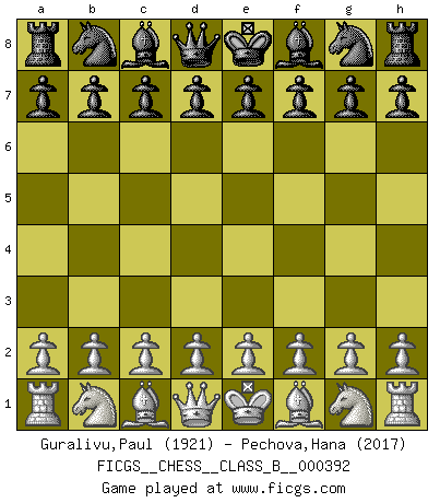 First move 2026 February 21 14:7:32 Hana Pechova ... is in vacation until 2026 February 23 9:25:52 White clock - 39 days 03:59:31 Black clock - 40 days 00:00:00 [Event "FICGS__CHESS__CLASS_B__000392"] [Site "FICGS"] [Date "2026.02.21"] [Round "1"] [White "Guralivu,Paul"] [Black "Pechova,Hana"] [Result "*"] [WhiteElo "1921"] [BlackElo "2017"] 1.* Follow this game move after move (download)The isolated Pawn casts gloom over the entire chessboard. (Aaron Nimzovich) Ohne Fehler kann es keine Brillanz geben. (Emanuel Lasker) Aunque la mayoría de la gente disfruta observar las partidas de los grandes Maestros de ataque, algunos de los jugadores mas notables en la historia han sido los jugadores silenciosos posicionales. Lentamente ellos te aplastan despojandote de tu espacio, congestionando tus piezas y dejandote virtualmente sin nada que hacer. (Yasser Seirawan) Si le désir cupide (et stupide) de gagner est une inépuisable source de souffrance, une combinaison brillante sur l'échiquier est une découverte : le coquelicot qui s'épanouit lorsque apparaît la Voie Lactée. (Arrabal) Any activity becomes creative when the doer cares about doing it right or doing it better. (John Updike)