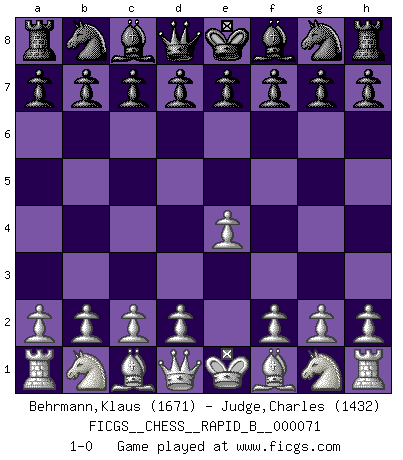 Last move : 1-0 2007 November 14 19:13:46 [Event "FICGS__CHESS__RAPID_B__000071"] [Site "FICGS"] [Date "2007.10.12"] [Round "1"] [White "Behrmann,Klaus"] [Black "Judge,Charles"] [Result "1-0"] [WhiteElo "1671"] [BlackElo "1432"] 1.e4 1-0 This chess game has been lost on time (started : 2007.10.12 13:20:58) King's pawn Opening Player White won this chess game. Follow this game move after move (download)You may learn much more from a game you lose than from a game you win. You will have to lose hundreds of games before becoming a good player. (Jose Raul Capablanca) Verschiedene, sehr schätzbare und im Laufe des Lebens nützliche Eigenschaften des Geistes können durch das Schachspiel erworben und gekräftigt werden, so dass sie zu Gewohnheiten werden, die uns nie im Stich lassen. (Benjamin Franklin) Cuando tu no sabes absolutamente que mas hacer, es tiempo de entrar en pánico. (John van der Wiel) On n'a jamais que l'âge auquel on a commence à jouer aux échecs car après on cesse de vieillir. (Capablanca) The Internet is the world's largest library. It's just that all the books are on the floor. (John Allen Paulos)