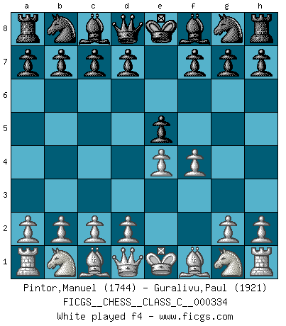 Last move : f4 2026 February 27 16:1:8 White clock - 39 days 05:59:31 Black clock - 38 days 18:43:16 [Event "FICGS__CHESS__CLASS_C__000334"] [Site "FICGS"] [Date "2026.02.26"] [Round "1"] [White "Pintor,Manuel"] [Black "Guralivu,Paul"] [Result "*"] [WhiteElo "1744"] [BlackElo "1921"] 1.e4 e5 2.f4 * Follow this game move after move (download)The tactician knows what to do when there is something to do; whereas the strategian knows what to do when there is nothing to do. (Gerald Abrahams) Es ist im Leben wie im Schachspiel. Wir entwerfen einen Plan, dieser bleibt jedoch bedingt durch das, was im Schachspiel dem Gegner, im Leben dem Schicksal zu tun belieben wird. (Arthur Schopenhauer) No volvere nunca a jugar contigo. Has insultado a mi amigo. - cuando un oponente se maldijo por una mala jugada (Miguel Najdorf) Ne tendez aucun piège pour le plaisir ! Ne jouez rien dans l'espoir que l'adversaire réagisse de façon stupide ! Prenez toujours pour acquis que l'adversaire va trouver le meilleur coup ! Ne jouez jamais de coup dans l'espoir que l'adversaire ne voie pas la menace ! Chacun de vos coups doit améliorer la position d'une façon ou d'une autre. There are two kinds of people in the world, my friend. Those who have a loaded gun and those who dig. You dig ! (Blondie in The Good, The Bad and The Ugly)