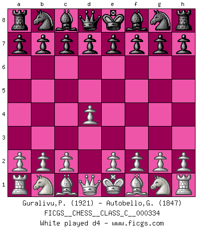Last move : d4 2026 February 26 14:42:47 White clock - 39 days 20:15:59 Black clock - 38 days 06:17:11 [Event "FICGS__CHESS__CLASS_C__000334"] [Site "FICGS"] [Date "2026.02.26"] [Round "1"] [White "Guralivu,Paul"] [Black "Autobello,Giovanni"] [Result "*"] [WhiteElo "1921"] [BlackElo "1847"] 1.d4 * Follow this game move after move (download)I like to say that Bobby Fischer was the greatest player ever. But what made Fischer a genius was his ability to blend an American freshness and pragmatism with Russian ideas about strategy. (Bruce Pandolfini) Kasparov ist eine Art Monster mit hundert Augen, denen auch nicht das Geringste entgeht. (Tony Miles) Cuando la partida de Ajedrez termina, el Peón y el Rey regresan a la misma caja. (Irish saying) Le système Elo représente seulement une moyenne. Il est simplement un indicateur de votre stabilité. (Anatoli Karpov) The general who wins the battle makes many calculations in his temple before the battle is fought. The general who loses makes but few calculations beforehand. (Sun Tzu)