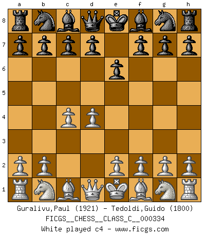 Last move : c4 2026 February 27 15:50:2 White clock - 39 days 18:45:00 Black clock - 38 days 04:05:58 [Event "FICGS__CHESS__CLASS_C__000334"] [Site "FICGS"] [Date "2026.02.26"] [Round "1"] [White "Guralivu,Paul"] [Black "Tedoldi,Guido"] [Result "*"] [WhiteElo "1921"] [BlackElo "1800"] 1.d4 e6 2.c4 * Follow this game move after move (download)Chess is in its essence a game, in its form an art, and in its execution a science. (Baron Tassilo) Schon mancher Spieler hat aufgegeben, um zu vermeiden, daß er eine Figur verliert. (Savielly Grigorievitsch Tartakower) El Ajedrez se juega con la mente... ¡no con las manos!. (Renaud y Kahn) Les échecs sont plus proches de l'art de l'assassinat que de l'art de la guerre. (Arturo Perez-Reverte) It's not the size of the dog in the fight, it's the size of the fight in the dog. (Mark Twain)