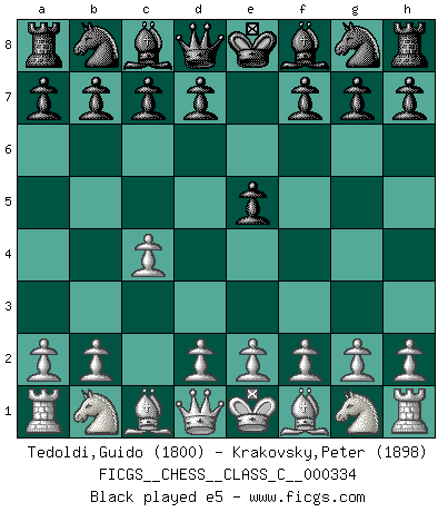 Last move : e5 2026 February 27 15:25:28 White clock - 37 days 23:56:12 Black clock - 39 days 22:54:00 [Event "FICGS__CHESS__CLASS_C__000334"] [Site "FICGS"] [Date "2026.02.26"] [Round "1"] [White "Tedoldi,Guido"] [Black "Krakovsky,Peter"] [Result "*"] [WhiteElo "1800"] [BlackElo "1898"] 1.c4 e5 2.* Follow this game move after move (download)He who takes the Queen's Knight's Pawn will sleep in the streets. (Anonymous) Über Kasparov: Es ist offensichtlich, daß er in einem totalitären Staat aufwuchs und deshalb zu diktatorischen Zügen neigt. (Viktor Kortschnoi) El Ajedrez no es como la vida... ¡tiene reglas!. (Mark Pasternak) Si le désir cupide (et stupide) de gagner est une inépuisable source de souffrance, une combinaison brillante sur l'échiquier est une découverte : le coquelicot qui s'épanouit lorsque apparaît la Voie Lactée. (Arrabal) Gambling : The sure way of getting nothing from something. (Wilson Mizner)