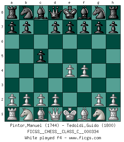 Last move : f4 2026 February 27 16:6:40 White clock - 39 days 10:18:55 Black clock - 38 days 12:32:02 [Event "FICGS__CHESS__CLASS_C__000334"] [Site "FICGS"] [Date "2026.02.26"] [Round "1"] [White "Pintor,Manuel"] [Black "Tedoldi,Guido"] [Result "*"] [WhiteElo "1744"] [BlackElo "1800"] 1.e4 c5 2.f4 * Follow this game move after move (download)Chess holds its master in its own bonds, shackling the mind and brain so that the inner freedom of the very strongest must suffer. (Albert Einstein) Wie kann ich Remis annehmen? Ich weiß ja gar nicht, wie ich stehe! (Fritz Sämisch) No hay un Gran Maestro de Ajedrez que sea normal; solo se diferencían ellos por la magnitud de su locura. (Viktor Korchnoi) Le joueur d'Echecs qui veut atteindre le top est obligé de développer son propre credo créatif. Alexeï Stepanovicth Souétine. Il est facile d'écrire des livres ! Ce qui est difficile, c'est de jouer ! (Alexeï Stepanovicth Souétine) When you've done things right people won't know you've done anything at all. (Futurama)