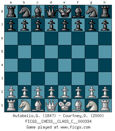 First move 2026 February 26 10:58:46 White clock - 38 days 02:34:07 Black clock - 40 days 00:00:00 [Event "FICGS__CHESS__CLASS_C__000334"] [Site "FICGS"] [Date "2026.02.26"] [Round "1"] [White "Autobello,Giovanni"] [Black "Courtney,Daniel"] [Result "*"] [WhiteElo "1847"] [BlackElo "2000"] 1.* Follow this game move after move (download)Fischer is an American Chess tragedy on par with Morphy and Pillsbury. (Mig Greengard) Fischer machte Schach einfach zu einer aufregenden Sache, wann immer er sich ans Brett setzte. (Raymond Keene) Todos los Maestros de Ajedrez fueron un día unos principiantes. (Chernev) RxDa4 pat (...) There are two types of people in this world, good and bad. The good sleep better, but the bad seem to enjoy the waking hours much more. (Woody Allen)