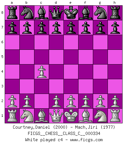 Last move : c4 2026 February 26 11:4:3 White clock - 39 days 23:54:43 Black clock - 37 days 22:56:15 [Event "FICGS__CHESS__CLASS_C__000334"] [Site "FICGS"] [Date "2026.02.26"] [Round "1"] [White "Courtney,Daniel"] [Black "Mach,Jiri"] [Result "*"] [WhiteElo "2000"] [BlackElo "1977"] 1.c4 * Follow this game move after move (download)You must take your opponent into a deep dark forest where 2+2=5, and the path leading out is only wide enough for one. (Mikhail Tal) Auf Remis zu spielen ist gewissermaßen ein Verbrechen gegen das Schachspiel. (Mikhail Nekhemyevich Tal) El Ajedrez se juega con la mente... ¡no con las manos!. (Renaud y Kahn) Il n'y a pas de prix trop élevé au scalp de l'ennemi. (Koblentz) Men should grow up. - Yeah. And dogs should stop licking themselves. It's not gonna happen. (Gregory House to Dr. Cameron, House M.D.)