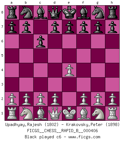 Last move : c6 2026 February 27 15:24:2 White clock - 28 days 21:35:01 Black clock - 30 days 19:44:41 [Event "FICGS__CHESS__RAPID_B__000406"] [Site "FICGS"] [Date "2026.02.26"] [Round "1"] [White "Upadhyay,Rajesh"] [Black "Krakovsky,Peter"] [Result "*"] [WhiteElo "1802"] [BlackElo "1898"] 1.e4 c6 2.* Follow this game move after move (download)I have never in my life played the French Defence, which is the dullest of all openings. (Wilhelm Steinitz) Das typische an einem Großmeister ist, daß er eine gewonnene Position schnell und schmerzlos gewinnt. (Irving Chernev) ¿Que sería del Ajedrez sin errores graciosos?. (Kurt Richter) A chaque perte on perd un peu de soi. (Joël Lautier) Treat your password like your toothbrush. Don't let anybody else use it, and get a new one every six months. (Clifford Stoll)