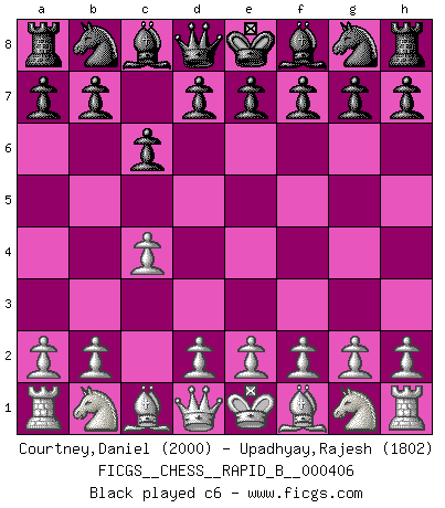 Last move : c6 2026 February 27 10:11:36 White clock - 29 days 16:25:38 Black clock - 30 days 00:52:33 [Event "FICGS__CHESS__RAPID_B__000406"] [Site "FICGS"] [Date "2026.02.26"] [Round "1"] [White "Courtney,Daniel"] [Black "Upadhyay,Rajesh"] [Result "*"] [WhiteElo "2000"] [BlackElo "1802"] 1.c4 c6 2.* Follow this game move after move (download)All I want to do, ever, is just play Chess. (Bobby Fischer) Wenn du auf das Glück wartest, wird das Leben ziemlich langweilig. (Mikhail Nekhemyevich Tal) El Ajedrez expande y enriquece tu mente. (Saudin Robovic) En blitz, le Cavalier l'emporte sur le Fou. (Vlastimil Hort) 'preceded by its own quotation yields a falsehood' preceded by its own quotation yields a falsehood. (W. V. O. Quine - Set Theory And Its Logic, 1953)