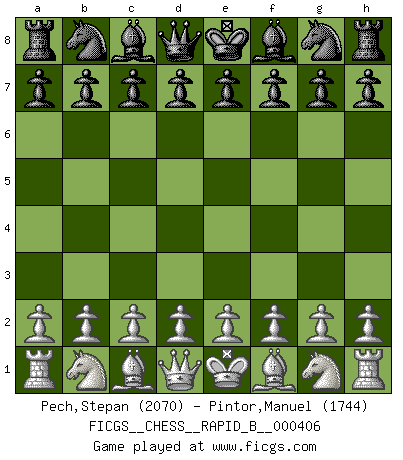 First move 2026 February 26 11:0:32 White clock - 28 days 11:20:38 Black clock - 30 days 00:00:00 [Event "FICGS__CHESS__RAPID_B__000406"] [Site "FICGS"] [Date "2026.02.26"] [Round "1"] [White "Pech,Stepan"] [Black "Pintor,Manuel"] [Result "*"] [WhiteElo "2070"] [BlackElo "1744"] 1.* Follow this game move after move (download)A Chess game is a dialogue, a conversation between a player and his opponent. Each move by the opponent may contain threats or be a blunder, but a player cannot defend against threats or take advantage of blunders if he does not first ask himself: What is my opponent planning after each move ? (Bruce A. Moon) In Buenos Aires ist es nicht mein vorrangiges Ziel ein starkes Turnier zu organisieren, sondern ein Turnier für Gentlemen. Ich würde nie Kamsky einladen. Ich mag keine Probleme. (Miguel Najdorf) Nada excita más a Grandes Maestros aburridos que una novedad teórica. (Dominic Lawson) Comme les marins qui ont mille raisons différentes d'aller en mer, les joueurs d'échecs en ont tout autant avant de s'installer devant une table et jouer... (Vincent Bertignac, philosophe) Art is not a thing, it is a way. (Elbert Hubbard)
