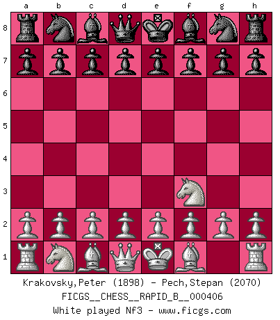 Last move : Nf3 2026 February 26 14:5:41 White clock - 30 days 20:54:51 Black clock - 28 days 11:21:30 [Event "FICGS__CHESS__RAPID_B__000406"] [Site "FICGS"] [Date "2026.02.26"] [Round "1"] [White "Krakovsky,Peter"] [Black "Pech,Stepan"] [Result "*"] [WhiteElo "1898"] [BlackElo "2070"] 1.Nf3 * Follow this game move after move (download)An attack on the wing should be met by play in the center. (Nimzovitch) Ich bewundere Kasparows phantasievolle Angriffssiege aus den Achtzigern und Neunzigern, aber wenn man sie mit dem Computer überprüft, nimmt der Computer in jeder zweiten Partie die Opfer an, verteidigt sich und gewinnt. (Vladimir Kramnik) Ciertamente, de todas la drogas del mundo, el Ajedrez debe ser el mas placentero permamentemente. (Assiac) Un journaliste : 'Vous préférez avoir une dame de plus sur l'échiquier ou au lit ?' Boris Spassky : 'Ca dépend de la position.' In theory there is no difference between theory and practice. In practice there is. (Yogi Berra)
