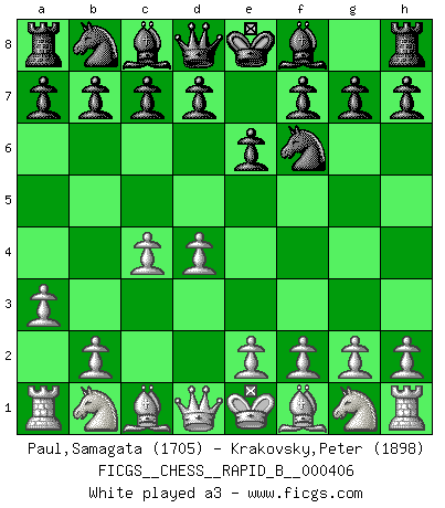 Last move : a3 2026 February 27 16:38:32 White clock - 32 days 20:25:00 Black clock - 29 days 22:29:50 [Event "FICGS__CHESS__RAPID_B__000406"] [Site "FICGS"] [Date "2026.02.26"] [Round "1"] [White "Paul,Samagata"] [Black "Krakovsky,Peter"] [Result "*"] [WhiteElo "1705"] [BlackElo "1898"] 1.d4 Nf6 2.c4 e6 3.a3 * Follow this game move after move (download)Half the variations which are calculated in a tournament game turn out to be completely superfluous. Unfortunately, no one knows in advance which half. (Jan Tinman) Wenn Du absolut nicht mehr weißt, was Du tun sollst, dann ist es Zeit für Panik. (John van der Wiel) El Ajedrez es tan interesante por sí solo, que no es necesario un interés monetario para persuadir a una persona a que lo practique; por lo tanto, nunca se juega por dinero. (Benjamin Franklin) Le pion, dans sa simplicité, marche droit devant lui, mais lorsqu'il prend, il le fait obliquement? Ainsi l'homme, tant qu'il reste pauvre, marche dans la droiture et vit honnêtement, mais lorsqu'il recherche les honneurs, il flatte, se parjure et, par les voies obliques, cherche une position supérieure sur l'échiquier du monde. (Jean de Galles) When I took office, only high energy physicists had ever heard of what is called the World Wide Web... Now even my cat has its own page. (Bill Clinton, 1996)