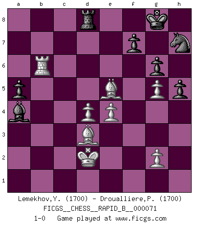 Last move : 1-0 2007 December 26 13:8:28 [Event "FICGS__CHESS__RAPID_B__000071"] [Site "FICGS"] [Date "2007.10.12"] [Round "1"] [White "Lemekhov,Yura"] [Black "Droualliere,Philippe"] [Result "1-0"] [WhiteElo "1700"] [BlackElo "1700"] 1.d4 Nf6 2.c4 e6 3.Nc3 Bb4 4.e3 O-O 5.Bd3 c5 6.Nf3 Nc6 7.O-O d5 8.a3 Bxc3 9.bxc3 b6 10.cxd5 exd5 11.Ne5 Qd6 12.Nxc6 Qxc6 13.f3 Re8 14.Qe2 Bd7 15.a4 g6 16.Qf2 cxd4 17.cxd4 Qd6 18.Bd2 a5 19.Rfb1 Rac8 20.Qg3 Qxg3 21.hxg3 Re6 22.g4 h6 23.Rb2 Kg7 24.Kf2 Be8 25.Ke2 R8c6 26.Be1 h5 27.g5 Nh7 28.Bh4 Rc8 29.Kd2 Bd7 30.Ra3 Be8 31.Rab3 Bxa4 32.Rxb6 Rxb6 33.Rxb6 Ra8 34.e4 Rd8 35.Bg3 dxe4 36.Be5+ Kg8 37.fxe4 1-0 Nimzo-Indian : 4.e3 O-O, 5.Bd3 Kingside Castling by player Black (move 4) Kingside Castling by player White (move 7) Player White won this chess game. Follow this game move after move (download)By the beauty of his games, the clarity of his play, and the brilliance of his ideas, Fischer made himself an artist of the same stature as Brahms, Rembrandt, and Shakespeare. (David Levy) Die Idee von Capablanca, Schach als Fach in den Schulen zu lehren, ist großartig. (Fidel Castro) En la perfecta combinación de Ajedrez como en una historia corta de primera clase, toda la trama y contra trama deberá conducir hacia un final sorprendente, el interes no es mitigado hasta el último momento. (Yates and Winter) Il vaut mieux sacrifier les pièces de l'adversaire. (Xavier Tartacover) Now you put water in a cup, it becomes the cup; You put water into a bottle it becomes the bottle; You put it in a teapot it becomes the teapot. Water can flow or it can crash. Be water, my friend. (Bruce Lee)