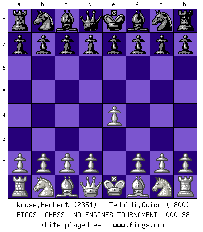 Last move : e4 2026 March 2 7:46:20 White clock - 39 days 23:39:00 Black clock - 38 days 23:27:55 [Event "FICGS__CHESS__NO_ENGINES_TOURNAMENT__000138"] [Site "FICGS"] [Date "2026.03.02"] [Round "1"] [White "Kruse,Herbert"] [Black "Tedoldi,Guido"] [Result "*"] [WhiteElo "2351"] [BlackElo "1800"] 1.e4 * Follow this game move after move (download)Live, lose, and learn, by observing your opponent how to win. (Amber Steenbock) Alle offensichtlichen Züge sehen nach dem Spiel in der Analyse verdächtig aus. (Viktor Kortschnoi) Cuando le juegas a Fischer, no es una cuestion de si vas a ganar o perder. Es una cuestion de si vas a sobrevivir. (Boris Spassky) Je crois qu'il existe des manières très spécifiques de jouer efficacement contre une machine. Evidemment, nous n'avons aucune chance en technique pure, parce que l'ordinateur calcule de manière parfaite. Mais lorsque nous faisons appel à notre cerveau, en utilisant l'intuition et la compréhension, alors nous restons beaucoup plus forts. (Anatoli Karpov) CHESS, n. f. [echecs, Fr.] A nice and abstruse game, in which two sets of puppets are moved in opposition to each other. (Dr Samuel Johnson, A Dictionary Of The English Language, 1755)