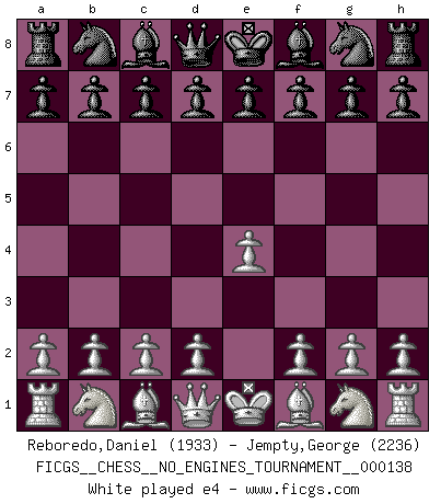 Last move : e4 2026 March 2 13:26:5 George Jempty ... is in vacation until 2026 March 14 22:11:31 White clock - 39 days 17:59:15 Black clock - 40 days 00:00:00 [Event "FICGS__CHESS__NO_ENGINES_TOURNAMENT__000138"] [Site "FICGS"] [Date "2026.03.02"] [Round "1"] [White "Reboredo,Daniel"] [Black "Jempty,George"] [Result "*"] [WhiteElo "1933"] [BlackElo "2236"] 1.e4 * Follow this game move after move (download)The beauty of a move lies not in its' appearance but in the thought behind it. (Siegbert Tarrasch) Ich verstehe mehr vom Schach als irgendein anderer lebender Meister. (José Raúl Capablanca) ¿Esta Bobby Fischer algo cuerdo?. (Salo Flohr) Les pièces de l'échiquier étaient impitoyables. Elles le retenaient, elles l'absorbaient. Il y avait de l'horreur en cela, mais aussi une harmonie unique. Car, qu'y a-t-il dans le monde, à part les échecs ? (V. Nabokov) Better than a thousand days of diligent study is one day with a great teacher. (Japanese proverb)