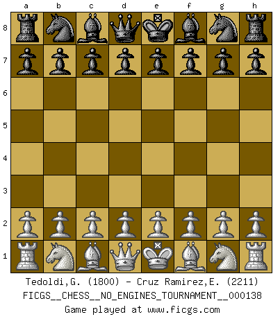 First move 2026 March 2 7:25:20 White clock - 39 days 02:25:00 Black clock - 40 days 00:00:00 [Event "FICGS__CHESS__NO_ENGINES_TOURNAMENT__000138"] [Site "FICGS"] [Date "2026.03.02"] [Round "1"] [White "Tedoldi,Guido"] [Black "Cruz Ramirez,Eliecer"] [Result "*"] [WhiteElo "1800"] [BlackElo "2211"] 1.* Follow this game move after move (download)I have always a slight feeling of pity for the man who has no knowledge of Chess. (Siegbert Tarrasch) Herr Iljumschinow ist ein etwas merkwürdiger Geschäftsmann: Er arbeitet zusammen mit Leuten wie Muammar al-Gaddafi; früher ist das Saddam Hussein gewesen. (Joel Lautier) Entre mas años cumplo, mas valoro los Peones. (Keres) Un footballeur joue avec ses pieds, parfois avec sa tête. Un joueur d'échecs ne joue qu'avec sa tête. Et quand il ne joue plus, il meurt. (Jacob Murray) A person who never made a mistake never tried anything new. (Albert Einstein)
