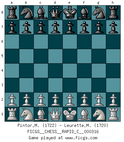 First move 2026 March 2 15:51:51 White clock - 29 days 14:07:31 Black clock - 30 days 00:00:00 [Event "FICGS__CHESS__RAPID_C__000316"] [Site "FICGS"] [Date "2026.03.02"] [Round "1"] [White "Pintor,Manuel"] [Black "Leurette,Marc-Antoine"] [Result "*"] [WhiteElo "1722"] [BlackElo "1720"] 1.* Follow this game move after move (download)There just isn't enough televised Chess. (David Letterman) Deine Wertungszahl - vorausgesetzt einige Jahre schachliche Anstrengung - entspricht etwa dem zehnfachen Deines IQ plus 1000. (Jonathan Levitt) Por tratar de evitar la pérdida de una pieza, muchas personas han perdido una partida de Ajedrez. (Savielly Tartakover) Horreur, mais aussi harmonie suprême : qu'y avait-il en effet au monde en dehors des échecs ? Le brouillard, l'inconnu, le non-être... (Vladimir Nabokov) A good player is always lucky. (Capablanca)