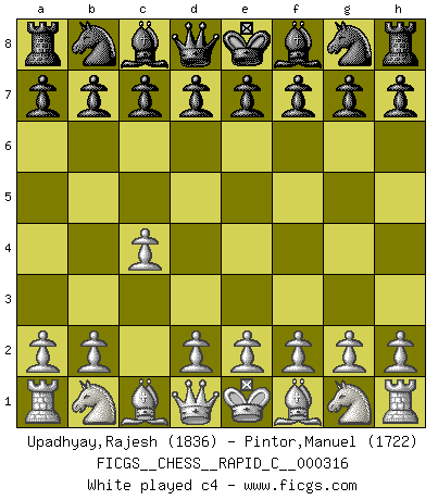 Last move : c4 2026 March 2 18:15:53 White clock - 30 days 21:35:58 Black clock - 29 days 18:23:58 [Event "FICGS__CHESS__RAPID_C__000316"] [Site "FICGS"] [Date "2026.03.02"] [Round "1"] [White "Upadhyay,Rajesh"] [Black "Pintor,Manuel"] [Result "*"] [WhiteElo "1836"] [BlackElo "1722"] 1.c4 * Follow this game move after move (download)Chess is a beautiful mistress. (Bent Larsen) Man gibt nur Pakete auf. (Paul Keres) No es una movida, aún la mejor movida que tu debas buscar, sino un plan comprensible. (Eugene Znosko-Borovsky) Si je n'étais pas joueur d'échecs, je serais le meilleur dans quelque chose d'autre. (Anatoli Karpov) The Internet isn't free. It just has an economy that makes no sense to capitalism. (Brad Shapcott)