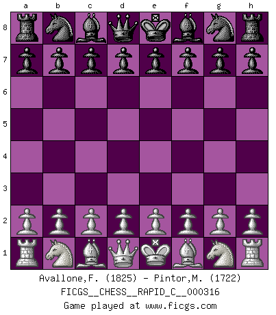 First move 2026 March 2 15:51:51 White clock - 29 days 12:42:39 Black clock - 30 days 00:00:00 [Event "FICGS__CHESS__RAPID_C__000316"] [Site "FICGS"] [Date "2026.03.02"] [Round "1"] [White "Avallone,Francesca"] [Black "Pintor,Manuel"] [Result "*"] [WhiteElo "1825"] [BlackElo "1722"] 1.* Follow this game move after move (download)When you see a good move, look for a better one. (Emanuel Lasker) Wenn Capablanka heute auf der Schachbühne erscheinen würde, hätte er ein halbes Jahr gebraucht um sich die Schachtheorie anzueignen. Und dann hätte er alles und jeden besiegt. (Mikhail Moiseyevich Botvinik) En el Ajedrez, cuando menos, el valiente hereda la tierra. (Edmar Mednis) Aidez vos pièces, elles vous aideront. (Paul Morphy) The only sure thing about luck is that it will change. (Wilson Mizner)