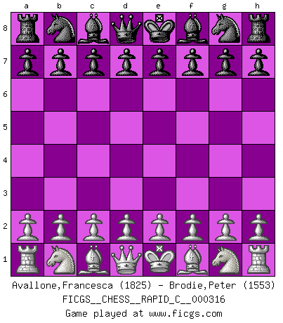 First move 2026 March 2 15:51:51 White clock - 29 days 12:42:51 Black clock - 30 days 00:00:00 [Event "FICGS__CHESS__RAPID_C__000316"] [Site "FICGS"] [Date "2026.03.02"] [Round "1"] [White "Avallone,Francesca"] [Black "Brodie,Peter"] [Result "*"] [WhiteElo "1825"] [BlackElo "1553"] 1.* Follow this game move after move (download)The older I grow, the more I value pawns. (Paul Keres) Die starken Figuren des Gegners muss man abtauschen. (José Raúl Capablanca) El Ajedrez lo es todo: arte, ciencia y deporte. (Anatoly Karpov) Un millionnaire : 'Monsieur Steinitz ! Vous ne participez aux tournois que pour l'argent, alors que moi je n'y viens que pour l'honneur.' Steinitz : 'Chacun joue pour ce qu'il n'a pas'... Programmer - an organism that turns coffee into software. (Anonymous)