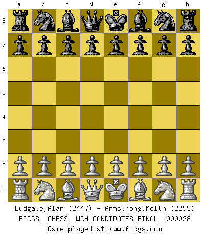 First move 2026 March 5 22:28:40 Alan Ludgate ... is in vacation until 2026 March 9 3:33:30 White clock - 29 days 18:55:10 Black clock - 30 days 00:00:00 [Event "FICGS__CHESS__WCH_CANDIDATES_FINAL__000028"] [Site "FICGS"] [Date "2026.03.05"] [Round "3"] [White "Ludgate,Alan"] [Black "Armstrong,Keith"] [Result "*"] [WhiteElo "2447"] [BlackElo "2295"] 1.* Follow this game move after move (download)I feel as if I were a piece in a game of Chess, when my opponent says of it: That piece cannot be moved. (Soren Kierkegaard) Ich trinke, ich rauche, ich spiele, ich liebe Frauen aber Fernschach ist ein Laster, das ich nicht habe. (Mikhail Nekhemyevich Tal) Coloca el contenido del tablero de Ajedrez en un sombrero, agita las piezas vigorosamente, derrámalas en el tablero desde una altura de medio metro y así obtienes el estilo de Wilhelm Steinitz. (H. E. Bird) On a dit que l'homme se distingue de l'animal par le fait qu'il achète plus de livres qu'il ne peut en lire. Je voudrais suggérer qu'inclure à la liste des livres quelques livres d'échecs rendrait la distinction manifeste. (Edward Lasker) Always remember that you are unique; just like everyone else. (Unknown)