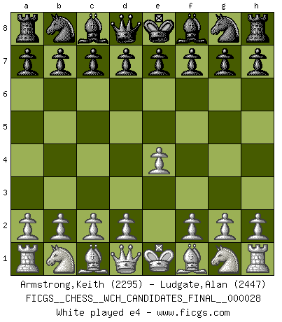 Last move : e4 2026 March 7 22:12:38 Alan Ludgate ... is in vacation until 2026 March 9 3:33:30 White clock - 29 days 00:16:02 Black clock - 30 days 00:00:00 [Event "FICGS__CHESS__WCH_CANDIDATES_FINAL__000028"] [Site "FICGS"] [Date "2026.03.05"] [Round "8"] [White "Armstrong,Keith"] [Black "Ludgate,Alan"] [Result "*"] [WhiteElo "2295"] [BlackElo "2447"] 1.e4 * Follow this game move after move (download)A Chess game is divided into three stages: the first, when you hope you have the advantage, the second when you believe you have an advantage, and the third... when you know you're going to lose ! (Savielly Tartakower) Ich las kürzlich ein Buch von Nietzsche. Er sagte Religion verdumme nur die Menschen. Ich stimme zu. (Robert James Fischer) Cuando tu no sabes absolutamente que mas hacer, es tiempo de entrar en pánico. (John van der Wiel) Les échecs sont utiles à l'exercice de la faculté de penser et à celle de l'imagination. Car nous devons posséder une méthode élaborée pour atteindre des buts partout où nous devons conduire notre raison. (Leibnitz) A generalist learns less and less about more and more until he knows nothing about everything. (Author unknown)