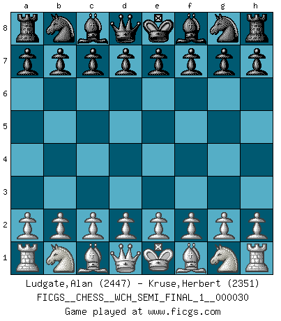 First move 2026 March 5 22:34:27 Alan Ludgate ... is in vacation until 2026 March 9 3:33:30 Herbert Kruse ... is in vacation until 2026 March 8 19:21:22 White clock - 29 days 19:00:57 Black clock - 30 days 00:00:00 [Event "FICGS__CHESS__WCH_SEMI_FINAL_1__000030"] [Site "FICGS"] [Date "2026.03.05"] [Round "7"] [White "Ludgate,Alan"] [Black "Kruse,Herbert"] [Result "*"] [WhiteElo "2447"] [BlackElo "2351"] 1.* Follow this game move after move (download)All my games are real. (Bobby Fischer) Schach ist ein Reich, wo sich die menschliche Phantasie frei entfalten kann. (David Bronstein) El Ajedrez lo es todo: arte, ciencia y deporte. (Anatoly Karpov) Les échecs, c'est la lutte contre l'erreur. (Johannes Zukertort) Horse racing is animated roulette. (Roger Kahn)