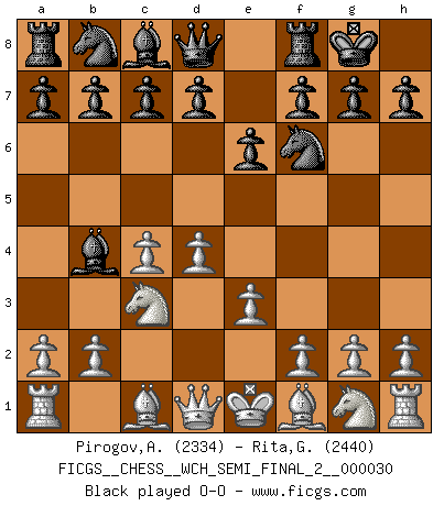 Last move : O-O 2026 March 9 22:53:8 White clock - 32 days 07:29:54 Black clock - 31 days 13:59:08 [Event "FICGS__CHESS__WCH_SEMI_FINAL_2__000030"] [Site "FICGS"] [Date "2026.03.05"] [Round "2"] [White "Pirogov,Andrey Mikhaylovich"] [Black "Rita,Giacomo"] [Result "*"] [WhiteElo "2334"] [BlackElo "2440"] 1.d4 Nf6 2.c4 e6 3.Nc3 Bb4 4.e3 O-O 5.* Follow this game move after move (download)Personally, I rather look forward to a computer program winning the world Chess Championship. Humanity needs a lesson in humility. (Richard Dawkings) Ihnen, Herr Lasker, habe ich nur drei Worte zu sagen: Schach und matt. (Siegbert Tarrasch) El Ajedrez es un regaderazo frío para la mente. (Sir John Simon) Toutes choses étant égales, c'est la conviction qui gagne. Alliée à une volonté de vaincre, elle sert de détonateur, suscite des idées, disperse les doutes et aide à penser clairement. (Robert Fischer) The Internet is the world's largest library. It's just that all the books are on the floor. (John Allen Paulos)