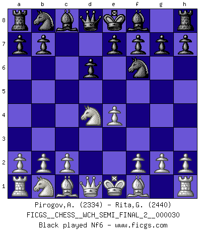 Last move : Nf6 2026 March 9 22:46:18 White clock - 32 days 04:40:46 Black clock - 31 days 18:18:35 [Event "FICGS__CHESS__WCH_SEMI_FINAL_2__000030"] [Site "FICGS"] [Date "2026.03.05"] [Round "6"] [White "Pirogov,Andrey Mikhaylovich"] [Black "Rita,Giacomo"] [Result "*"] [WhiteElo "2334"] [BlackElo "2440"] 1.e4 c5 2.Nf3 d6 3.d4 cxd4 4.Nxd4 Nf6 5.* Follow this game move after move (download)Chess is the art which expresses the science of logic. (Mikhail Botvinnik) Ich glaube nicht an Psychologie, ich glaube an gute Züge. (Robert James Fischer) Los tropiezos estan todos ahí en el tablero, esperando que se cometan. (Savielly Tartakover) J'ai vu le vaincu d'Echecs jouer des années durant dans l'espoir de la fête de la victoire. Car tu es plus riche de ce qu'elle existe si même elle n'est point pour toi. Ainsi de la perle du fond des mers. (Antoine de Saint-Exupéry) Establishing goals is all right if you don't let them deprive you of interesting detours. (Doug Larson)