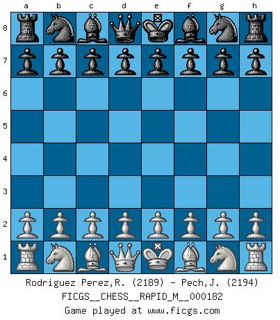 Last move : Bb5 2026 April 16 23:38:55 White clock - 21 days 16:53:39 Black clock - 8 days 08:20:03 [Event "FICGS__CHESS__RAPID_M__000182"] [Site "FICGS"] [Date "2026.03.12"] [Round "1"] [White "Rodriguez Perez,Rene"] [Black "Pech,Jaroslav"] [Result "*"] [WhiteElo "2189"] [BlackElo "2194"] 1.e4 e5 2.Nf3 Nc6 3.Bb5 * Follow this game move after move (download)Chess is the gymnasium of the mind. (Blaise Pascal) Im Schach gibt es keinen Platz für Galanterie. (Irving Chernev) Aquellos que dicen que entienden al Ajedrez, no entienden nada. (Robert Hubner) La solitude du joueur d'Echecs à l'approche du mat est semblable à celle du condamné. (Francis Szpiner) All men can see these tactics whereby I conquer, but what none can see is the strategy out of which victory is evolved. (Sun Tzu)