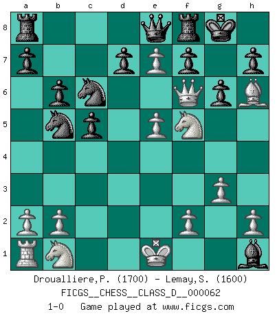 Last move : 1-0 2007 October 17 13:57:15 [Event "FICGS__CHESS__CLASS_D__000062"] [Site "FICGS"] [Date "2007.10.12"] [Round "1"] [White "Droualliere,Philippe"] [Black "Lemay,Simon"] [Result "1-0"] [WhiteElo "1700"] [BlackElo "1600"] 1.d4 Nf6 2.c4 e6 3.Nf3 b6 4.g3 Bb7 5.Bg2 c5 6.d5 exd5 7.Nh4 Ne4 8.cxd5 Nd6 9.e4 Be7 10.e5 Nb5 11.Nf5 O-O 12.Qg4 g6 13.d6 Bxg2 14.dxe7 Qe8 15.Bh6 Bxh1 16.Qh4 Nc6 17.Qf6 1-0 Queen's Indian : Rubinstein variation Kingside Castling by player Black (move 11) Player White won this chess game. Follow this game move after move (download)The enormous mental resilience, without which no Chess player can exist, was so much taken up by Chess that he could never free his mind of this game. (Albert Einstein) Bis zum Jahr 1971 verlief in meiner Schachkariere alles glatt. Dieses dramatische Match [Fischer-Taimanov 6:0] machte mein Leben zur Hölle. (Mark Taimanov) El ganar no lo es todo... pero el perder es nada. (Mednis) Le thème de l'attaque double intervient d'une manière ou d'une autre dans l'immense majorité des combinaisons. (Youri Averbakh) A cynic is a man who knows the price of everything but the value of nothing. (Oscar Wilde)