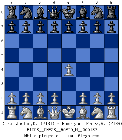 Last move : e4 2026 March 12 18:27:44 White clock - 30 days 23:45:20 Black clock - 29 days 19:25:44 [Event "FICGS__CHESS__RAPID_M__000182"] [Site "FICGS"] [Date "2026.03.12"] [Round "1"] [White "Cleto Junior,Dirceu"] [Black "Rodriguez Perez,Rene"] [Result "*"] [WhiteElo "2131"] [BlackElo "2189"] 1.e4 * Follow this game move after move (download)Who is your opponent tonight, tonight I am playing against the Black pieces. (Akiba Rubinstein) Fallen sollten polizeilich verboten werden. (Savielly Grigorievitsch Tartakower) En partidas rápidas, el Caballo es mas poderoso que el Alfil. (Vlastimil Hort) Le jeu d'échecs fait naître et fortifie en nous plusieurs qualités précieuses dans le cours de l'existence, telles que la prévoyance, la circonspection, la prudence, et la persévérance. (Benjamin Franklin - 1783, la morale des échecs) There is no instance of a country having benefited from prolonged warfare. (Sun Tzu)