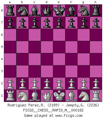 First move 2026 March 12 18:13:4 George Jempty ... is in vacation until 2026 March 14 22:11:31 White clock - 29 days 19:11:44 Black clock - 30 days 00:00:00 [Event "FICGS__CHESS__RAPID_M__000182"] [Site "FICGS"] [Date "2026.03.12"] [Round "1"] [White "Rodriguez Perez,Rene"] [Black "Jempty,George"] [Result "*"] [WhiteElo "2189"] [BlackElo "2236"] 1.* Follow this game move after move (download)I thought the most common mistake [in chess] was the first one: Learning the game :P (Garvin Gray, FICGS forum) Als er Schachweltmeister wurde ließ er praktisch alle stärksten Sovietspieler für sich arbeiten. Wenn ein auch nur mittelmässiger Meister ein Spezialist für eine bestimmte Eröffnung war, wurde er von Karpov gerufen. Das wurde alles geheim gehalten. (Mikhail Moiseyevich Botvinik) Solo el jugador con la iniciativa tiene el derecho a atacar. (Wilhelm Steinitz) La menace est plus forte que l'exécution. (Aaron Nimzovitch) If I had no sense of humor, I would long ago have committed suicide. (Mahatma Gandhi)