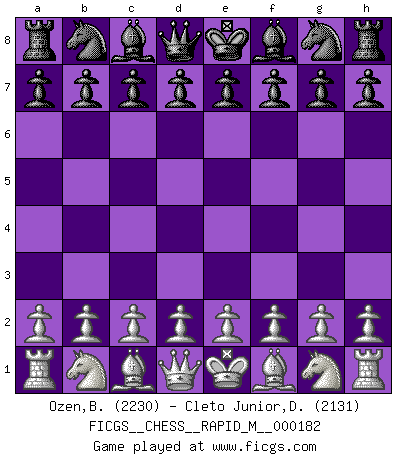 Last move : 1/2-1/2 2026 April 25 4:1:28 [Event "FICGS__CHESS__RAPID_M__000182"] [Site "FICGS"] [Date "2026.03.12"] [Round "1"] [White "Ozen,Bahadir"] [Black "Cleto Junior,Dirceu"] [Result "1/2-1/2"] [WhiteElo "2230"] [BlackElo "2131"] 1.d4 Nf6 2.c4 c5 3.d5 b5 4.cxb5 a6 5.e3 Bb7 6.Nc3 axb5 7.Bxb5 Qa5 8.Bd2 Qb6 9.a4 Nxd5 10.Nf3 e6 11.O-O Nb4 12.e4 Be7 13.Bf4 O-O 14.Bxb8 Rfxb8 15.Ne5 Qc7 16.Qxd7 Qxe5 17.Qxe7 Nc6 18.Qd7 Nd4 19.f4 Qf6 20.Qc7 Qd8 21.Qxd8+ Rxd8 22.Rfd1 h6 23.Kf2 g5 24.g3 Kf8 25.Rd2 1/2-1/2 Follow this game move after move (download)Suddenly it was obvious to me in my analysis I had missed what Fischer had found with the greatest of ease at the board. (Mikhail Botvinnik) Ein Isolani verdüstert die Stimmung auf dem ganzen Schachbrett. (Savielly Grigorievitsch Tartakower) Haz el enroque temprano y seguido. (Rob Sillars) A ce moment-là, je menaçais de comprendre la position ! (Clément L'Heureux) Watch your thoughts; they become words. Watch your words; they become actions. Watch your actions; they become habits. Watch your habits; they become character. Watch your character; it becomes your destiny. (Frank Outlaw)