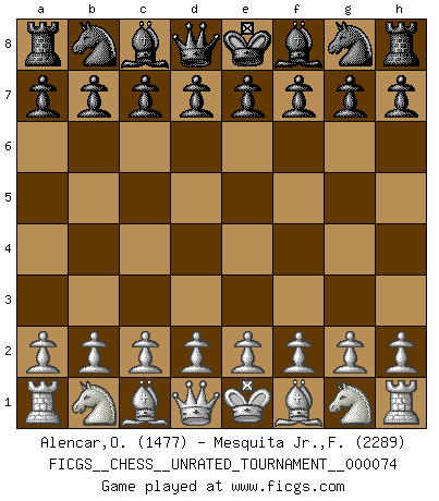 First move 2026 March 13 2:8:8 White clock - 39 days 14:00:13 Black clock - 40 days 00:00:00 [Event "FICGS__CHESS__UNRATED_TOURNAMENT__000074"] [Site "FICGS"] [Date "2026.03.13"] [Round "1"] [White "Alencar,Ofir"] [Black "Mesquita Jr.,Fausto Monteiro"] [Result "*"] [WhiteElo "1477"] [BlackElo "2289"] 1.* Follow this game move after move (download)Many Chess players were surprised when after the game, Fischer quietly explained: 'I had already analyzed this possibility' in a position which I thought was not possible to foresee from the opening. (Mikhail Tal) Matt entspricht nicht immer den Tatsachen. (Savielly Grigorievitsch Tartakower) ¡Examina movidas que hagan daño! Un buen ojo for movidas desvastantes es mucho mas importante que el conocimiento de principios estratégicos. (Purdy) La tactique est l'élément le plus important du milieu de jeu. (Siegbert Tarrasch) First of all, we have to go back to the classical time control. (Anatoly Karpov)