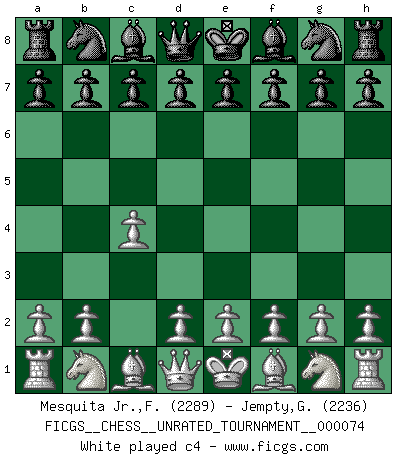 Last move : c4 2026 March 13 2:22:41 George Jempty ... is in vacation until 2026 March 14 22:11:31 White clock - 39 days 23:45:27 Black clock - 40 days 00:00:00 [Event "FICGS__CHESS__UNRATED_TOURNAMENT__000074"] [Site "FICGS"] [Date "2026.03.13"] [Round "1"] [White "Mesquita Jr.,Fausto Monteiro"] [Black "Jempty,George"] [Result "*"] [WhiteElo "2289"] [BlackElo "2236"] 1.c4 * Follow this game move after move (download)The mistakes are there, waiting to be made. (Savielly Tartakower) Es genügt nicht ein guter Spieler zu sein, man muß auch gut spielen. (Siegbert Tarrasch) Un buen sacrificio es aquel que aunque no sea necesariamente sólido, deja a tu oponente aturdido y confuso. (Rudolph Spielmann) J'ai toujours senti une vague pitié pour l'homme qui ne connaît rien aux échecs, tout comme j'en aurais pour un homme ignorant de l'amour. Les Echecs, comme la musique ou comme l'amour, ont le pouvoir de rendre heureux. (Siegbert Tarrasch) Chess is everything: art, science and sport. (Anatoly Karpov)