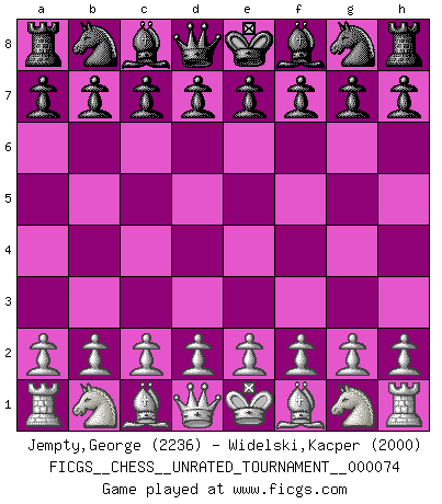 First move 2026 March 13 2:8:8 George Jempty ... is in vacation until 2026 March 14 22:11:31 White clock - 40 days 00:00:00 Black clock - 40 days 00:00:00 [Event "FICGS__CHESS__UNRATED_TOURNAMENT__000074"] [Site "FICGS"] [Date "2026.03.13"] [Round "1"] [White "Jempty,George"] [Black "Widelski,Kacper"] [Result "*"] [WhiteElo "2236"] [BlackElo "2000"] 1.* Follow this game move after move (download)We cannot resist the fascination of sacrifice, since a passion for sacrifices is part of a Chessplayer's nature. (Rudolf Spielman) Im Blitz ist es einfacher mit einer Figur weniger anzugreifen, als sich mit einer Mehrfigur zu verteidigen. (Mikhail Nekhemyevich Tal) El Ajedrez es un mar en el cual un mosquito puede beber y un elefante puede bañarse. (Refrán Hindú) Pour moi, les échecs ne sont pas un jeu mais un art. (Alexandre Alekhine) There is far too much law for those who can afford it and far too little for those who cannot. (Derek Bok)