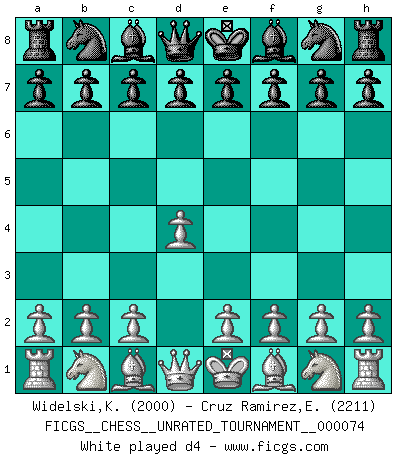 Last move : d4 2026 March 13 2:12:17 Eliecer Cruz Ramirez ... is in vacation until 2026 April 8 23:40:47 White clock - 39 days 23:55:51 Black clock - 40 days 00:00:00 [Event "FICGS__CHESS__UNRATED_TOURNAMENT__000074"] [Site "FICGS"] [Date "2026.03.13"] [Round "1"] [White "Widelski,Kacper"] [Black "Cruz Ramirez,Eliecer"] [Result "*"] [WhiteElo "2000"] [BlackElo "2211"] 1.d4 * Follow this game move after move (download)Chess makes man wiser and clear-sighted. (Vladimir Putin) Es ist peinlich, dass ich nie Weltmeister wurde. Es wäre leicht, Leonid Breschnjew als Ursache vorzuschieben, dessen Apparat den Vorzeigekommunisten Anatoli Karpow in allem unterstützte. Aber Garri Kasparow zum Beispiel, der ebenfalls von den Sowjets unerwünscht war, hat trotz der Widerstände den WM-Titel erobert. (Viktor Kortschnoi) El Ajedrez es imaginación. (David Bronstein) Karpov est une pièce de musée. (Garry Kasparov) Wipe them out. All of them. (Darth Sidious in Star Wars ep.1)