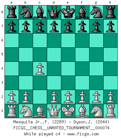 Last move : c4 2026 March 13 2:23:25 White clock - 39 days 23:44:43 Black clock - 39 days 17:24:35 [Event "FICGS__CHESS__UNRATED_TOURNAMENT__000074"] [Site "FICGS"] [Date "2026.03.13"] [Round "1"] [White "Mesquita Jr.,Fausto Monteiro"] [Black "Dyson,John"] [Result "*"] [WhiteElo "2289"] [BlackElo "2044"] 1.c4 * Follow this game move after move (download)It is not a move, even the best move that you must seek, but a realizable plan. (Eugene Znosko-Borovsky) Obwohl ich vom Stil her kaum zu den Priestern der Schachkunst gezählt werde, halte ich Schach doch für eine Kunst. (Tigran Petrosjan) Botvinnik trataba de restarle el misterio al Ajedrez, siempre relacionandolo a situaciones de la vida ordinaria. El gustaba de llamar al Ajedrez un típico problema inexacto similar a aquellos de los cuales la gente siempre tiene que enfrentarse en la vida cotidiana. (Garry Kasparov) La menace est plus forte que l'exécution. (Aaron Nimzovitch) Unless in communicating with it one says exactly what one means, trouble is bound to result. (Alan Turing, about computers)